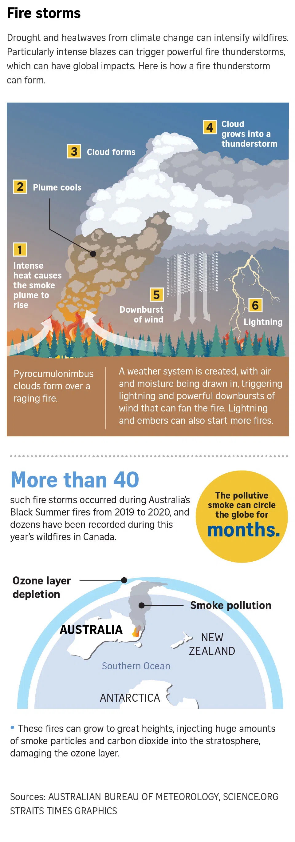 These storms can pump vast amounts of smoke particles and CO2 high into the stratosphere, a layer of the atmosphere that starts at between 6km and 20km above the earth’s surface and extends to about 50km.