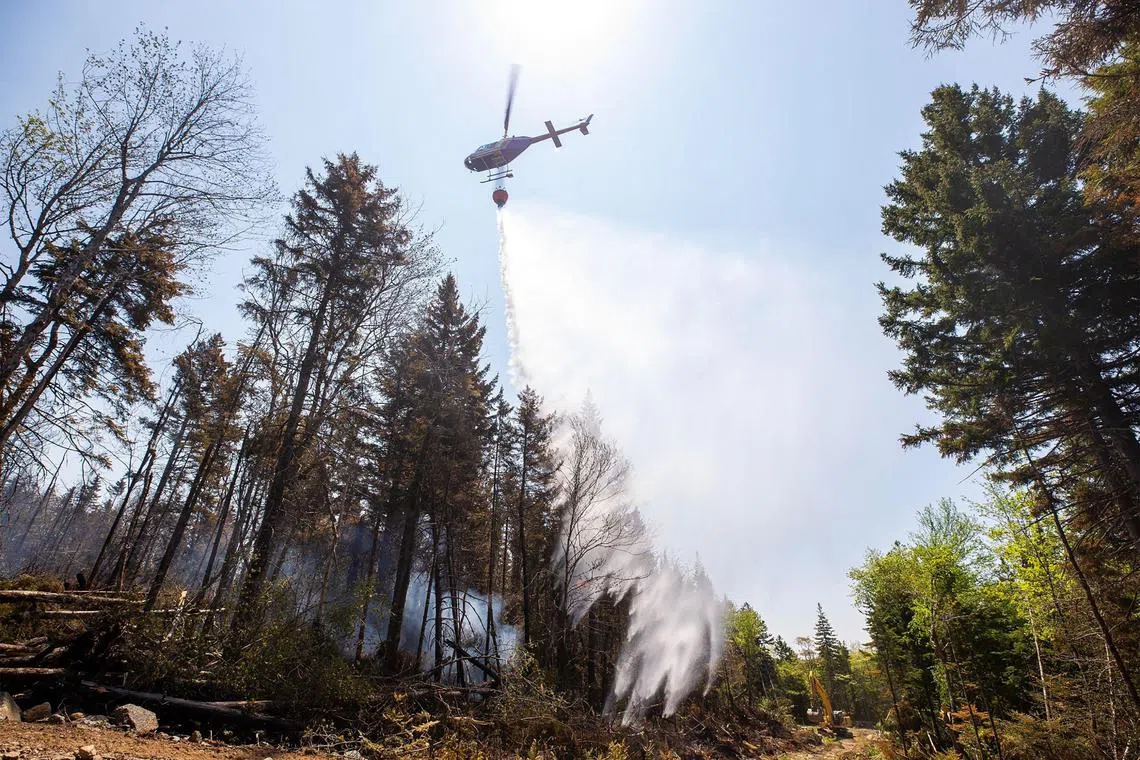 A helicopter dropping water on a hot spot behind Yankeetown Road as an excavator makes a fire break in the Tantallon wildfire, Canada.