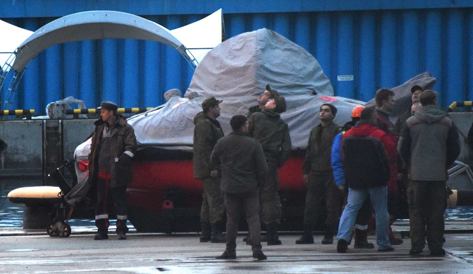 Staff wait next to an underwater bathyscaphe in the port of Sochi, on Dec 26, 2016, a day after a military plane carrying 92 people, including dozens of members of the Red Army Choir, crashed in the Black Sea.