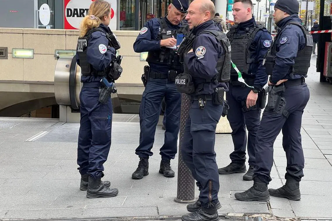 Police officers standing guard outside the Bibliotheque Francois-Mitterand station. The police shot a woman who was making threats on Oct 31.