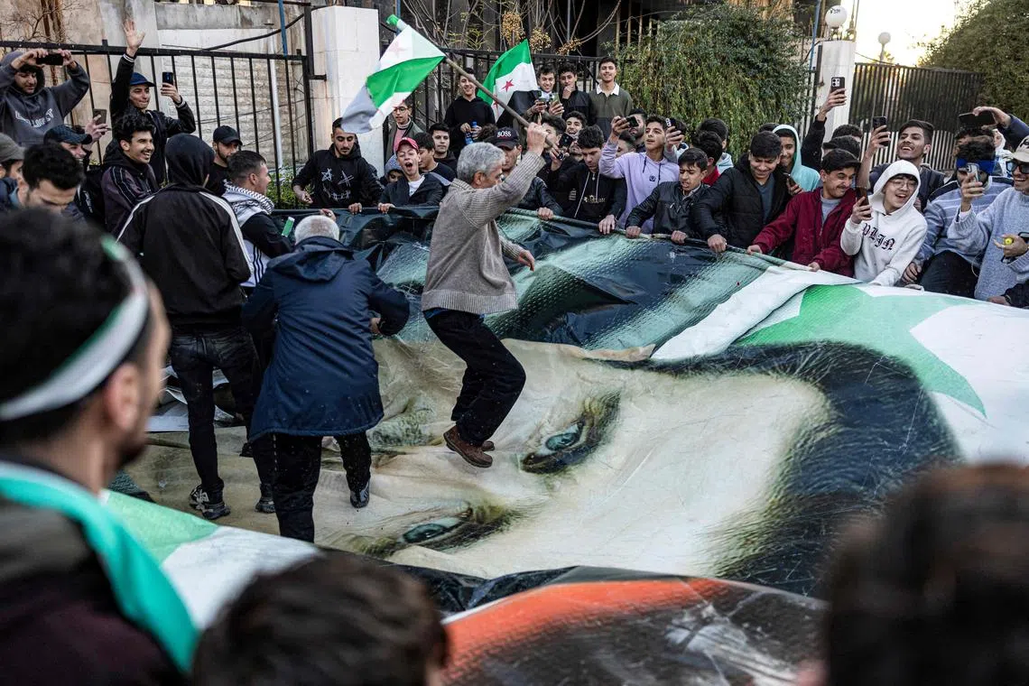 People stomp and tear apart a giant banner depicting the face of ousted Syrian leader Bashar al-Assad, in central Damascus on Dec 13.