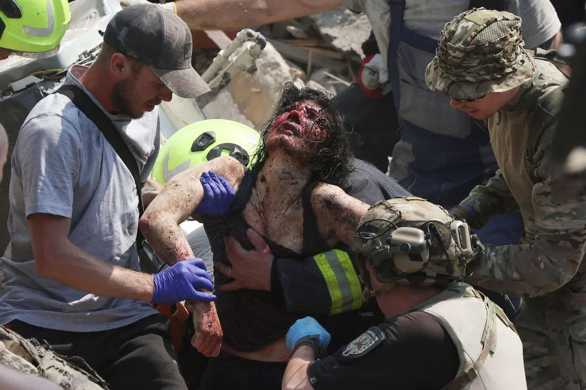 Rescue personnel retrieving a wounded woman from the rubble of a residential building, following a Russian air strike in Kyiv, in July 2024.